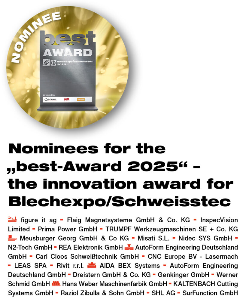 Der „best Award“ – Innovationspreis der internationalen Fachmesse Blechexpo/Schweisstec – wurde 2025 bereits zum zweiten Mal verliehen und hat sich innerhalb kurzer Zeit als relevante Auszeichnung im industriellen Umfeld etabliert. Ziel des Awards ist es, herausragende Leistungen sichtbar zu machen, Innovationen zu würdigen und Qualität, Mut sowie Zukunftsorientierung klar zu positionieren.